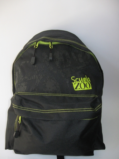 Zaino Americano Scuola Zoo nero con cerniera e marchio in giallo. Realizzato in resistente tessuto impermeabile, dotato di spallacci e schienale imbottiti. Unica tasca interna con chiusura a zip, all'esterno si trova una ampia tasca a zip. Misura cm 42 di altezza e cm 30 di larghezza.